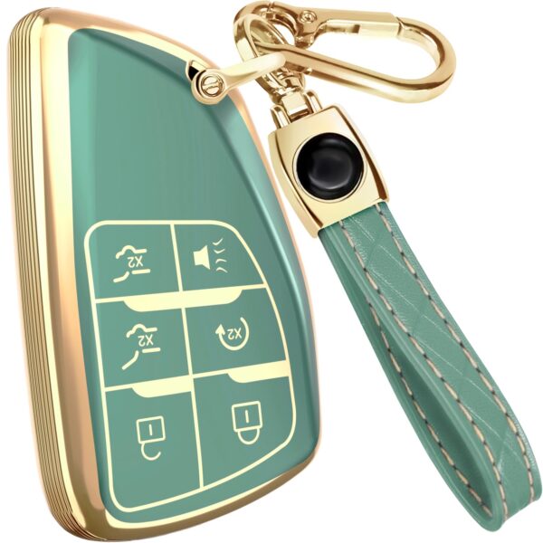 Lucrum Compatible with Chevy, GMC, and Buick Key Fob Cover & Leather Keychain – Green & Golden Edges