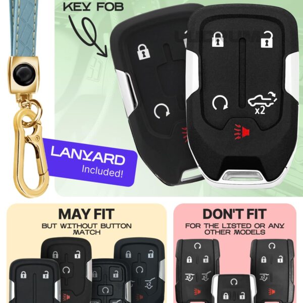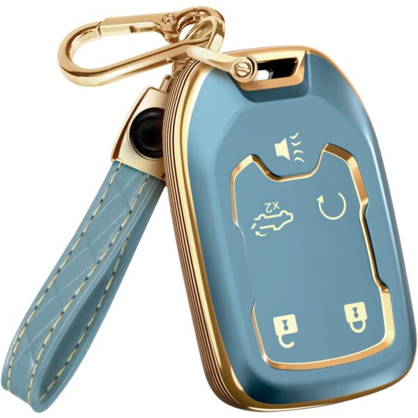 Lucrum Compatible with Chevy & GMC Key Fob Cover & Leather Keychain, 5 Buttons Keyfob Case for Acadia Sierra Silverado Tahoe Terrain Yukon (2014 – Blue & Golden Edges