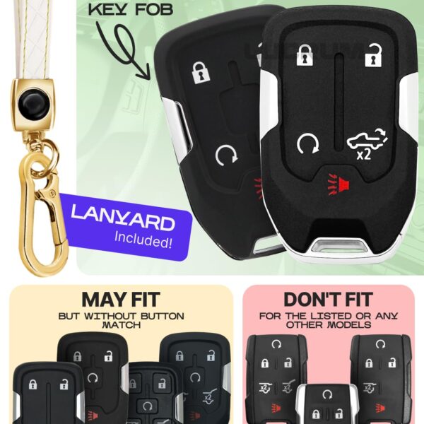 Lucrum Compatible with Chevy & GMC Key Fob Cover & Leather Keychain, 5 Buttons Keyfob Case for Acadia Sierra Silverado Tahoe Terrain Yukon (2014 – White & Golden Edges