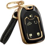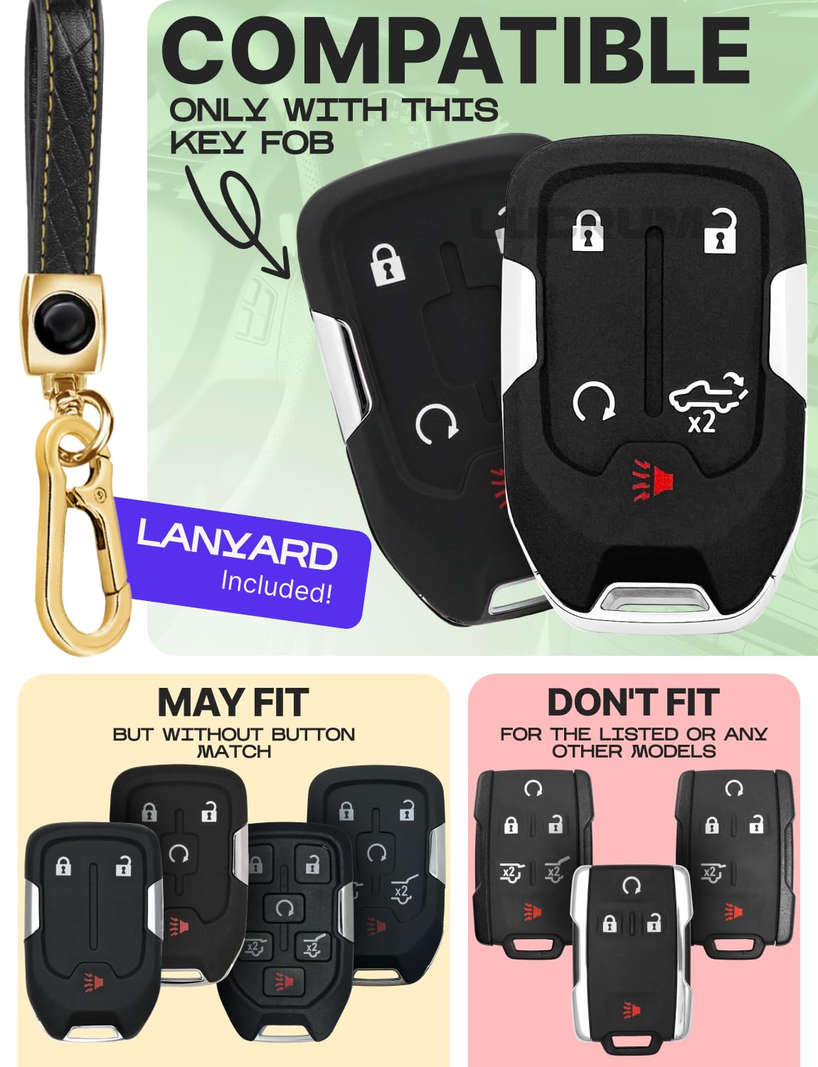 Lucrum Compatible with Chevy & GMC Key Fob Cover & Leather Keychain, 5 Buttons Keyfob Case for Acadia Sierra Silverado Tahoe Terrain Yukon (2014