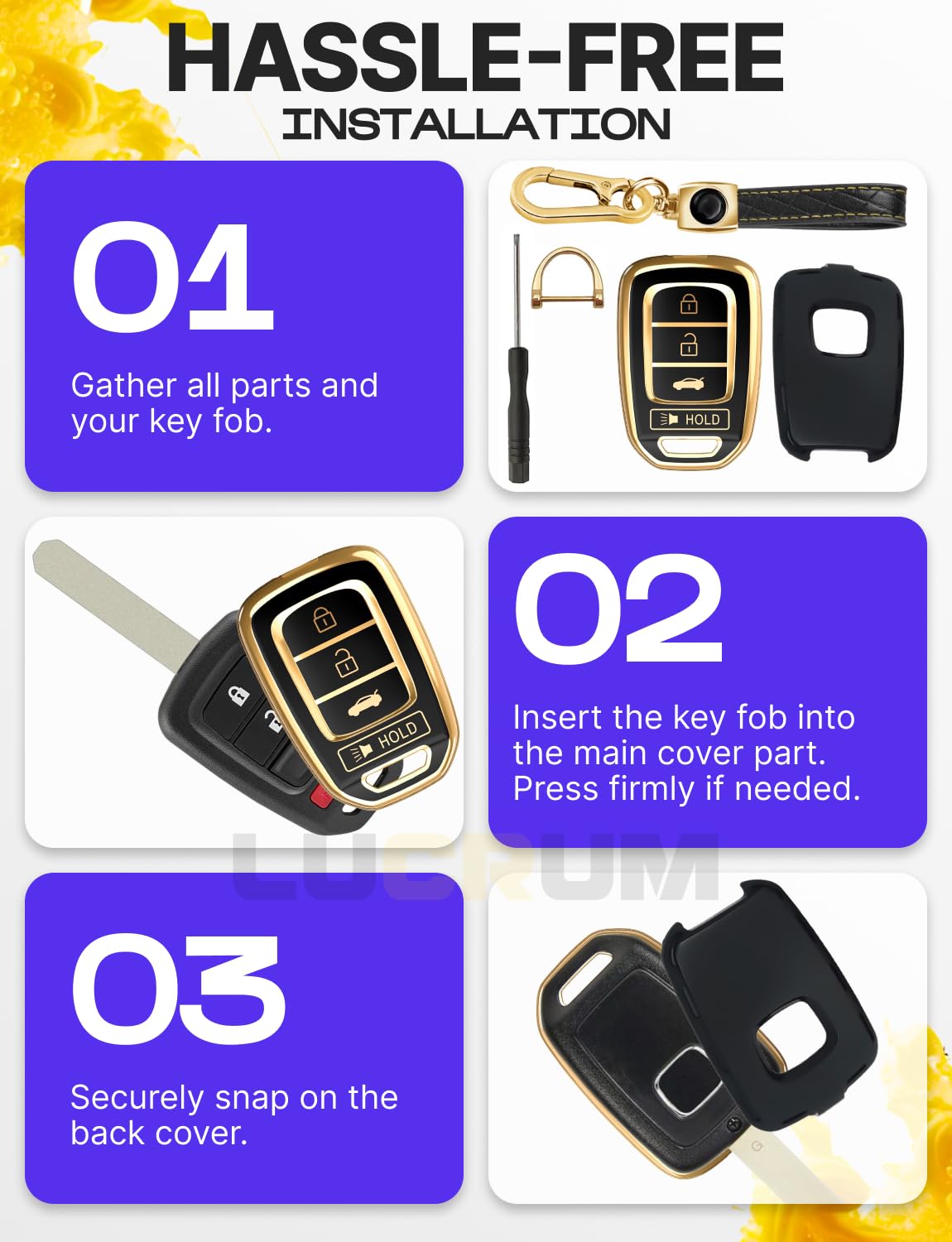 Tired of your plain key fob — or worried about damaging it?Lucrum’s premium TPU key fob cover is the perfect blend of style and protection. Whether you’re looking to upgrade the look of your fob or shield it from everyday wear, this cover is made to impress.Choose from a range of elegant colors and finishes to match your personality, your car, or your mood — because even the smallest accessories deserve a personal touch.Functional by DesignCarefully molded button slots protect against accidental presses while still offering smooth, responsive control. The cover wraps your fob in durable TPU, guarding it from scratches, scuffs, and drops—without compromising functionality.Smart Details That MatterA detachable leather keychain and metal carabiner add convenience and carry options, whether clipped to your bag or belt loop. A mini screwdriver is included for quick and easy keychain installation.Designed for a Perfect MatchCompatible with Honda models listed below:Accord – 2013, 2014, 2015, 2016, 2017