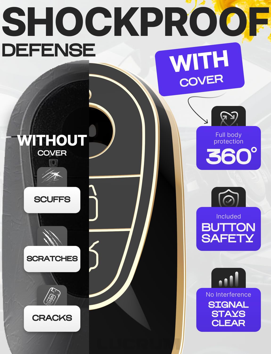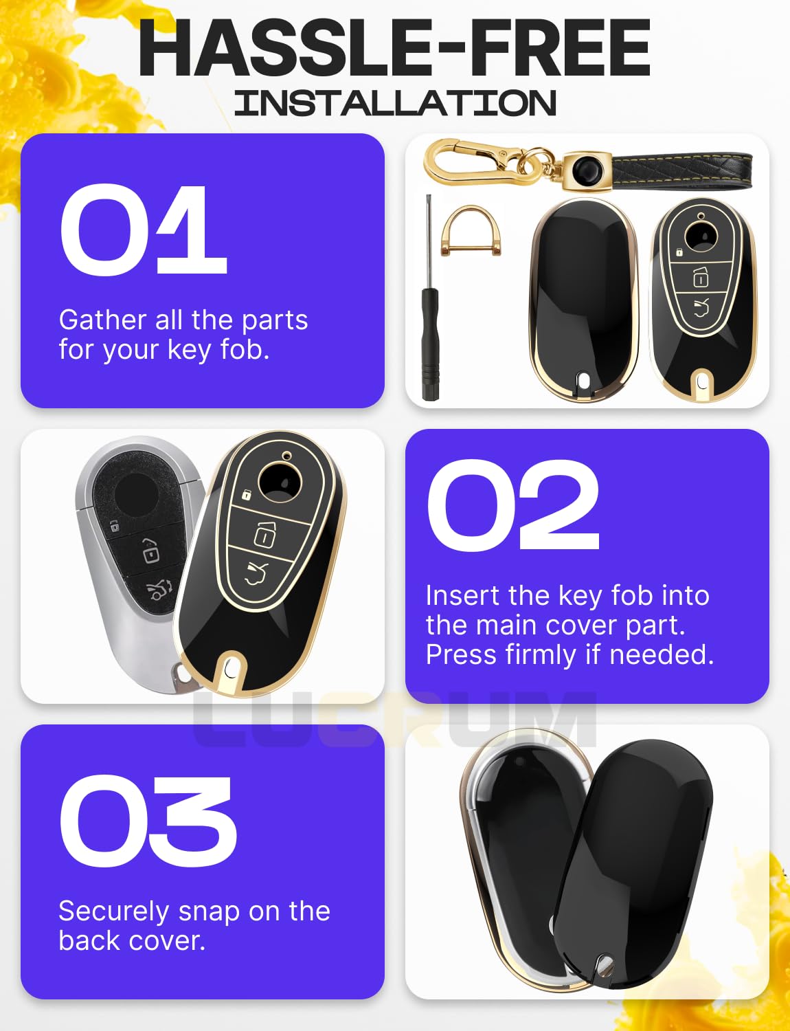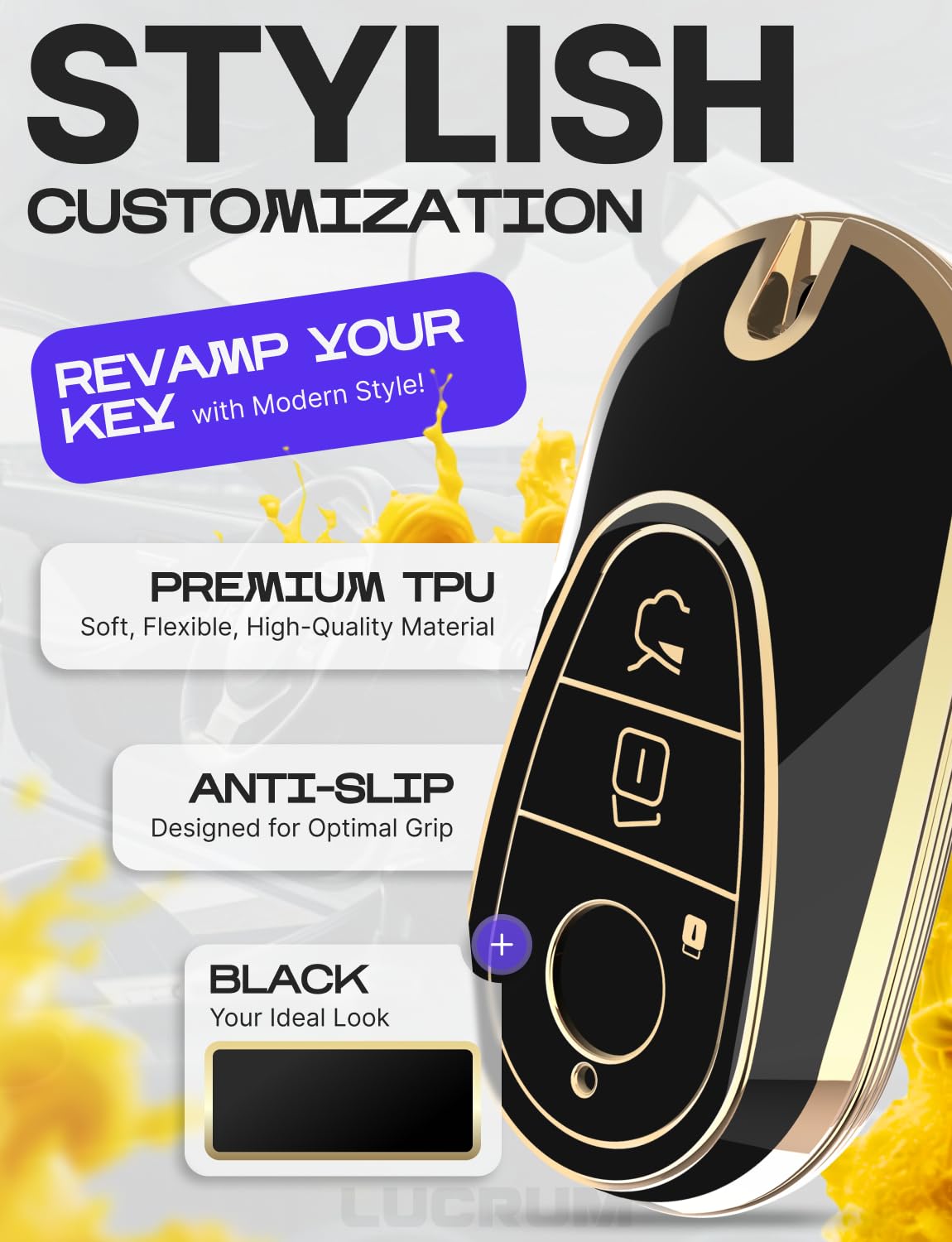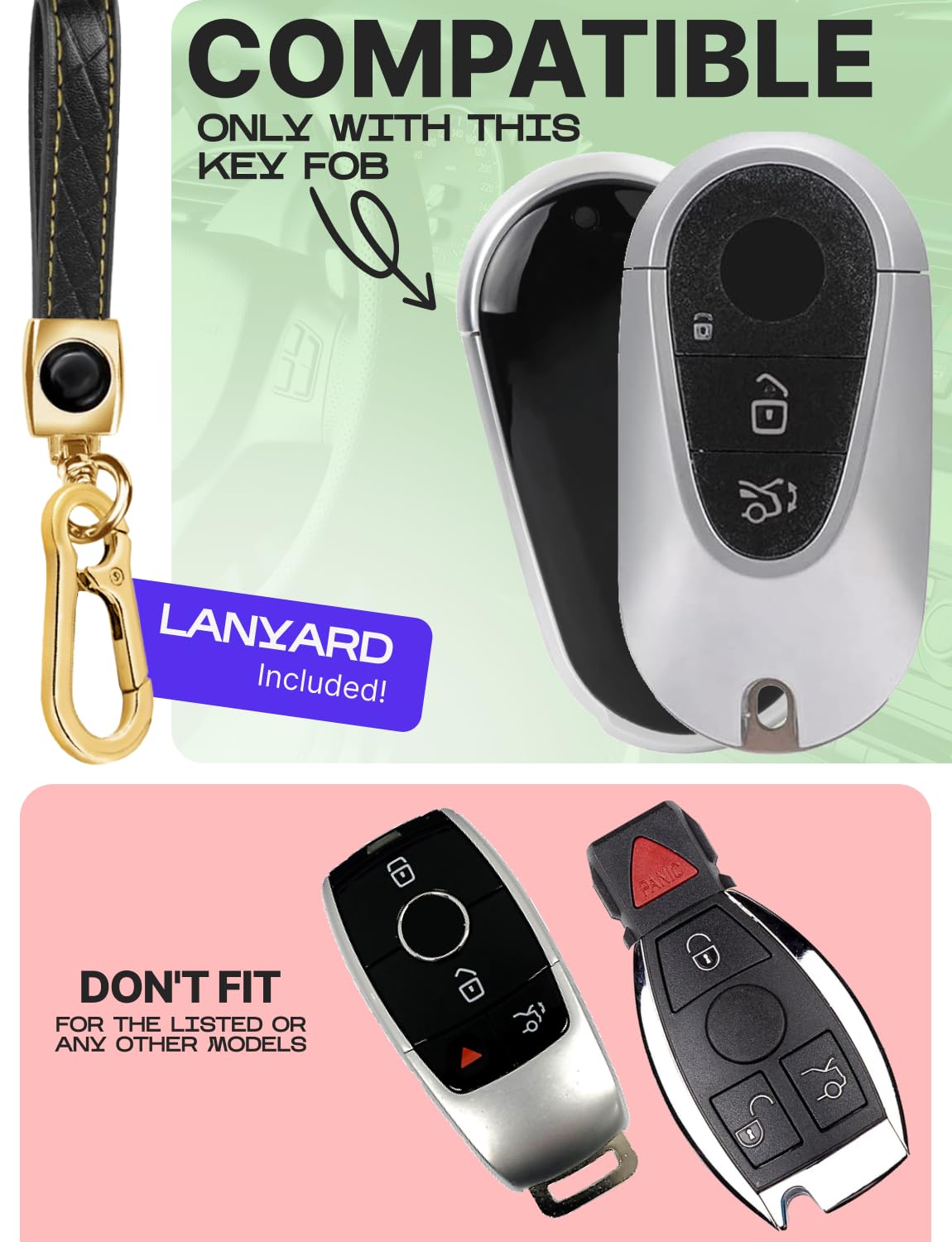 Lucrum key fob case is the best solution if you are not satisfied with the original design of the remote key fob or want to protect it from accidental damage.With its stylish design, the TPU key fob cover adds a touch of sophistication to your key fob, enhancing its overall appearance. Available in 3 colors and finishes, you can choose the one that matches your style and preferences.Compatible with Mercedes Benz models listed below:A-Class 2019-2023 (W177)C-Class 2022-2025 (W206)CLA 2020-2023 (C118)CLS 2021-2023 (C257)E-Class 2023-2025 (W214)EQS 2021-2025 (V297)G-Class 2021-2025 (W463, W464, W465)GL 2021-2025 (X167)GLA 2021-2025 (H247)GLC 2023-2025 (X254)GLE 2021-2025 (W167 / C167)GLS 2021-2025 (X167)SL 2021-2025 (R232)S-Class 2021-2025 (W223)Compatible FCC ID: IYZMS5I / IC: 2701A-MS5IIn addition to protecting the buttons of your key fob, the Lucrum key cover also safeguards them from accidental presses. The precise cutouts allow easy access to all the buttons, ports, and features of the Hyundai key fob, ensuring full functionality without the need to remove the cover.With its combination of style, button protection, all-around coverage, and the detachable keychain with a carabiner, the TPU key fob cover offers a practical and fashionable solution to keep your key fob safe and secure